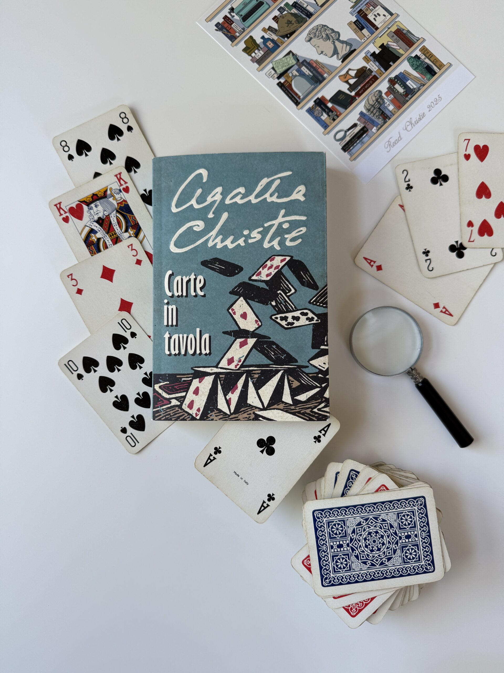 Una lettura molto piacevole che scorre in maniera veloce. Apprezzo nei romanzi della Christie quando indaga sulla parte psicologica. Ci sono alcuni riferimenti al gioco del bridge, come per esempio, come si contano i punti. Nonostante non sia una giocatrice di bridge non ho trovato difficile o faticoso seguire questa breve parte. Dopo tutto il titolo del libro è ‘Cards on the table’!